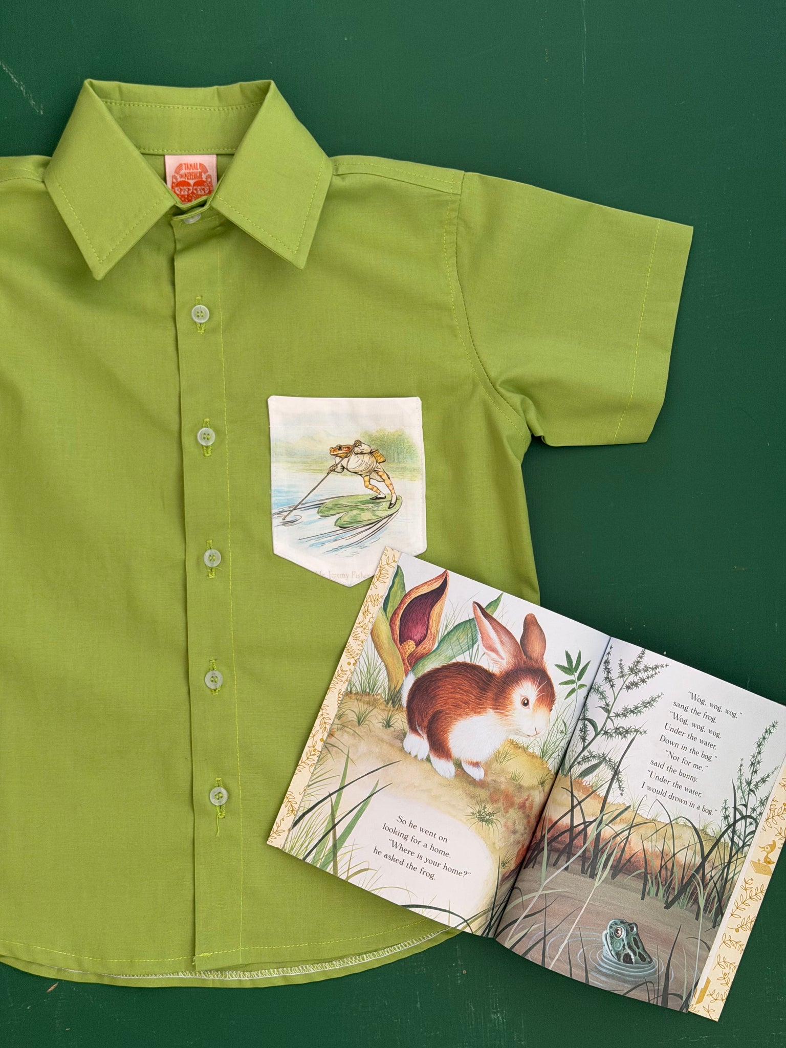 Camisa de manga corta en tela 100% de algodón importada. Color verde y bolsillo de uno de los personajes de este cuento clásico, tu peque se verá  súper cool.