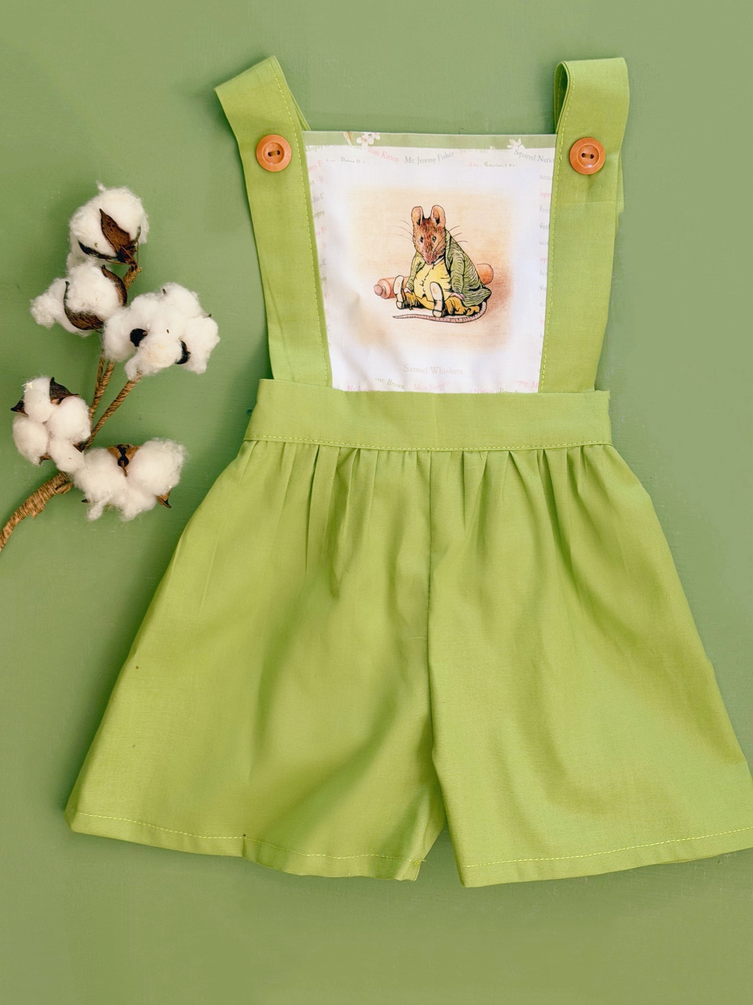 Overol de Short verde con tirantes que se amarran atrás. Tela 100% algodón con estampado de uno de los personajes del cuento de Peter Rabbit. . Perfecto para Primavera y Pascua, a tu peque le encantará este modelo.