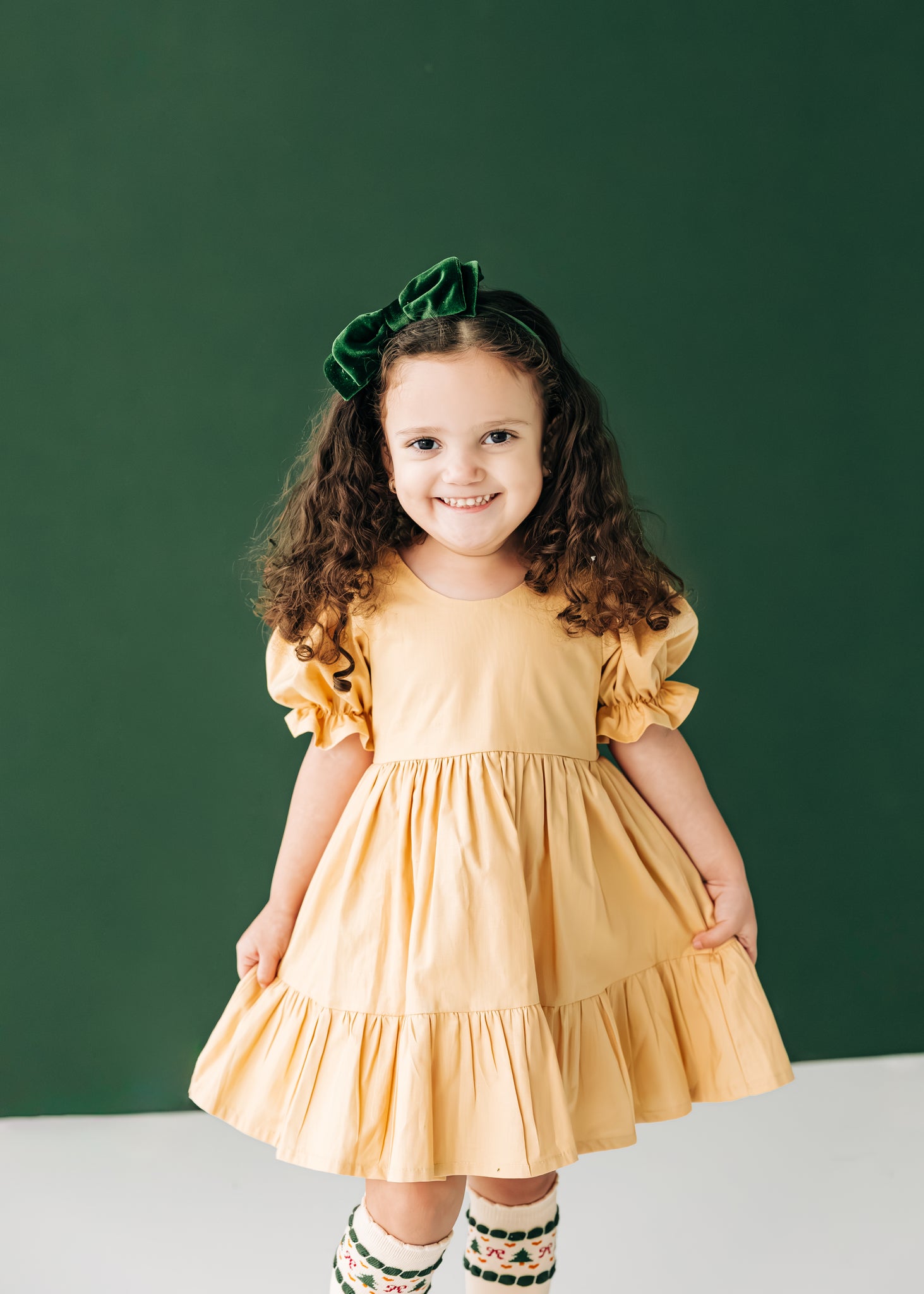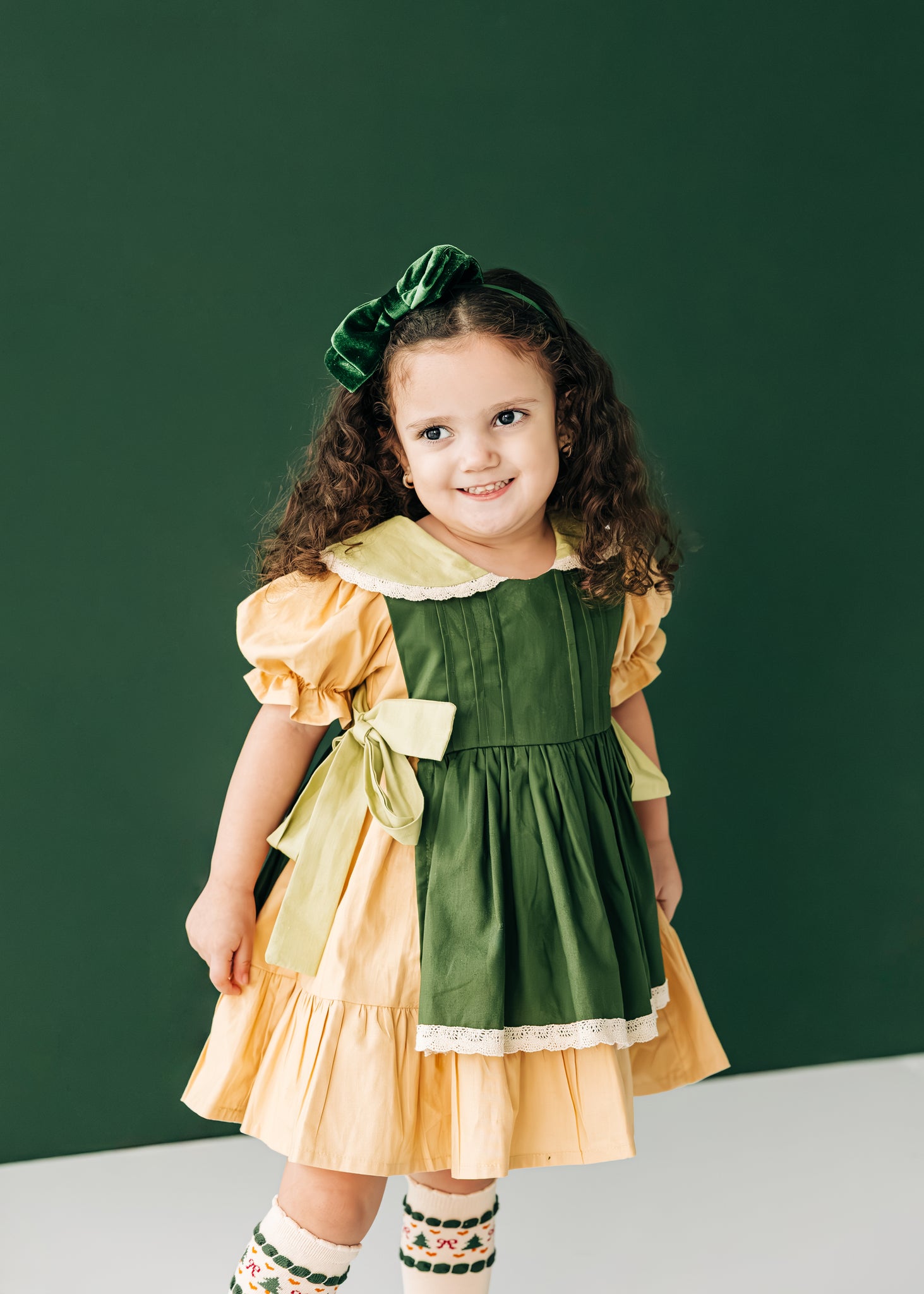 Vestido color kaki en silueta clásica con Hermoso mandil color verde profundo para completar el conjunto. Tela 100% algodón lo hacen cómodo. Perfecto para Sesiones de foto de Otoño/Invierno.
